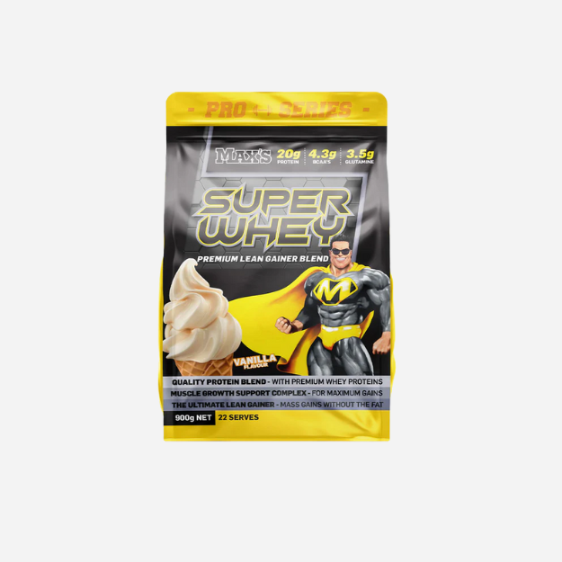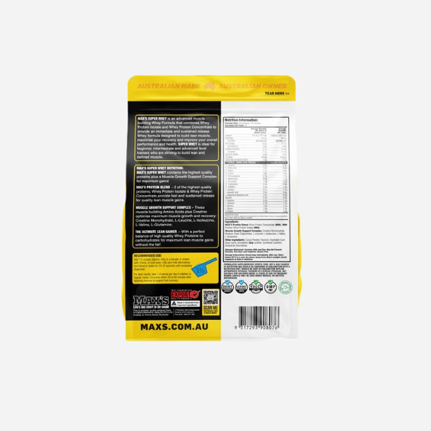 MAX’S SUPER WHEY is a high-quality lean muscle gainer engineered for serious results. With an optimal protein-to-carbohydrate ratio, it delivers the perfect balance to fuel growth, support recovery, and keep your gains lean and defined. Each serve combines fast and sustained-release whey proteins with added creatine to boost strength, enhance performance, and maximise muscle development – making it the ultimate formula for building quality size without the excess bulk.